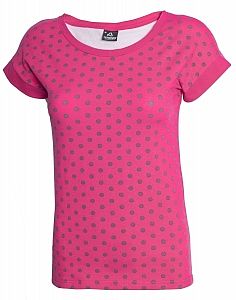 Dámske tričko s krátkym rukávom a so šedými bodkami. Okrúhly výstrih a koniec rukáva je lemovaný jednofarebnou látkou.