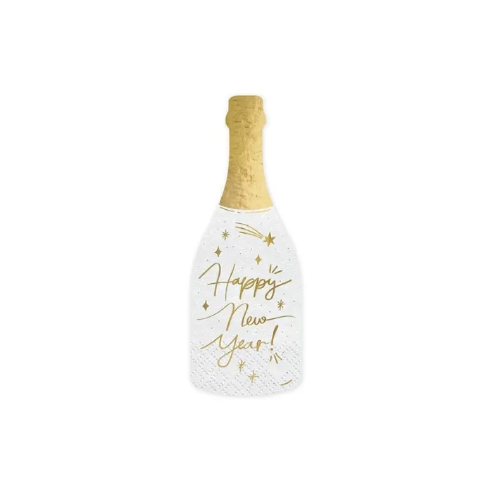 Papierové obrúsky v tvare fľaše šampanského s nápisom Happy New Year, ktoré nesmú chýbať na žiadnej Silvestrovskej párty.