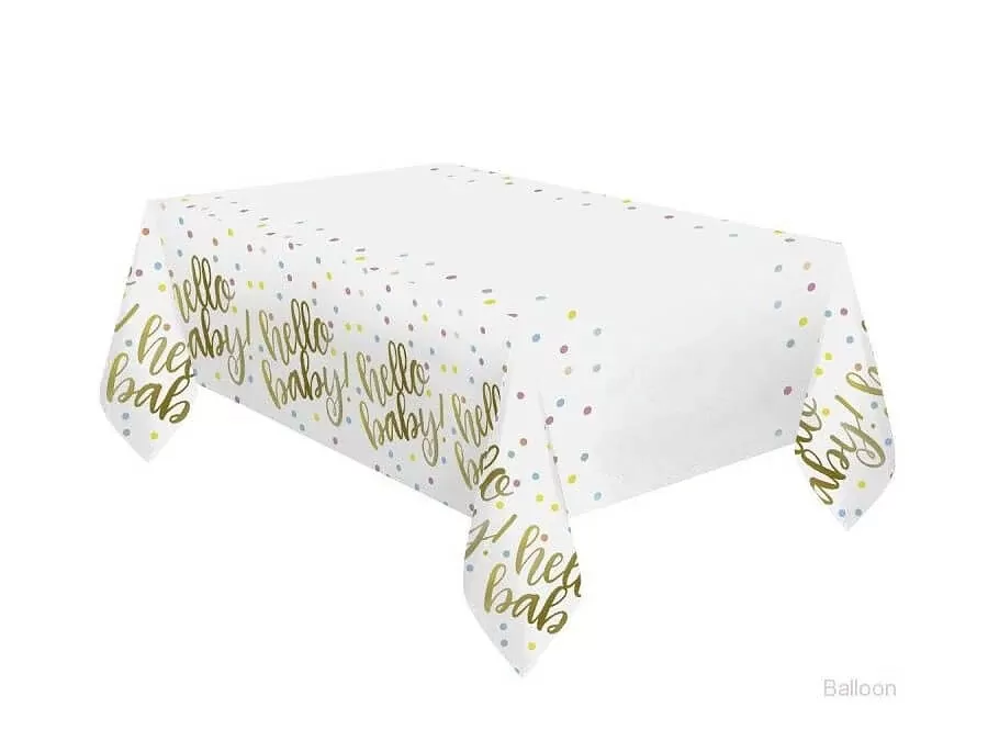 Plastový obrus v bielej farbe s farebnými bodkami a zlatým nápisom Hello Baby bude krásnou a praktickou dekoráciou na oslave pri privítaní nového člena na svet, alebo napríklad baby shower, kým neviete, či máte dievčatko, či chlapčeka.