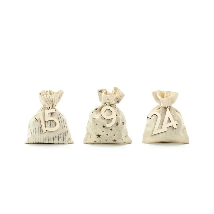 Adventný kalendár Vrecúška, sada obsahuje: 3 vzory bavlnených tašiek (8 z každého vzoru, veľkosť približne 10 x 13 cm), 24 bavlnených šnúr (dĺžka približne 30 cm) a 24 drevených čísel. Výrobok pre vlastnú montáž.