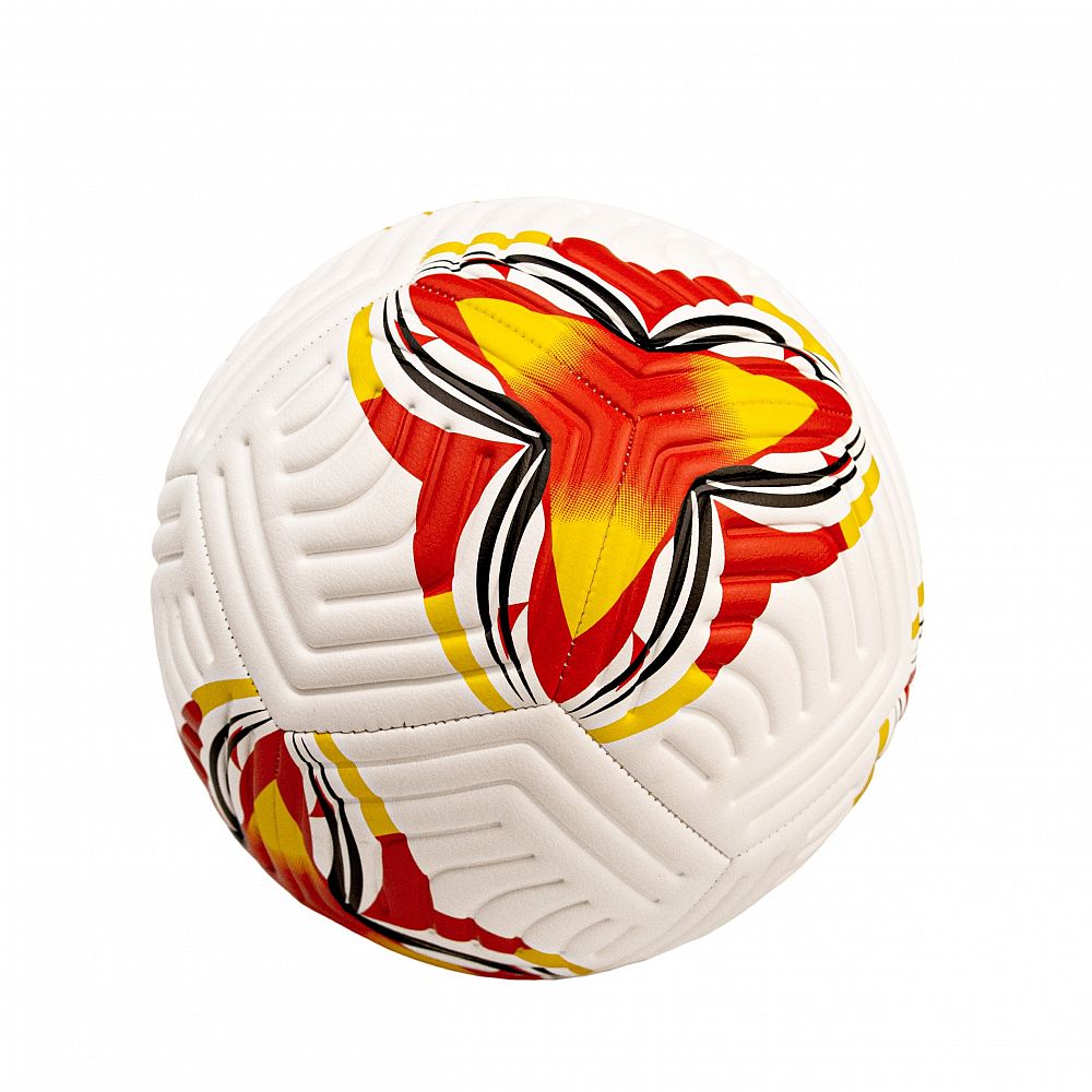 Dynamický Design: Lopta sa vyznačuje atraktívnym bielym základom s výraznými grafickými prvkami v kombinácii červenej a žltej farby. Tento moderný dizajn zaručuje, že lopta bude na ihrisku dobre viditeľná.
