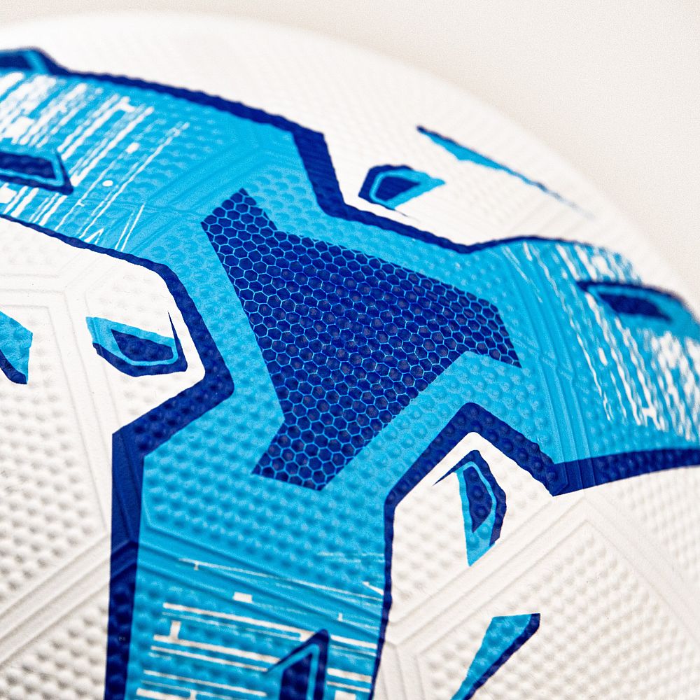 Moderný Modro-Biely Design: Lopta sa vyznačuje sviežim bielym základom a výraznými modrými grafickými prvkami vo futuristickom geometrickom štýle. Tento dizajn nielenže vyzerá skvele, ale pomáha aj s vizuálnou sledovateľnosťou lopty počas hry.