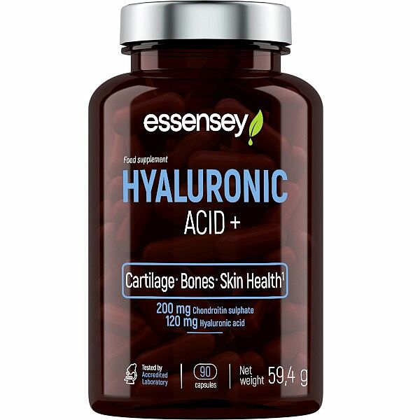 ESSENSEY HYALURONIC ACID +. Výživový doplnok. Prípravok v kapsuliach s obsahom chondroitín sulfátu, kyseliny hyalurónovej, L-prolínu a vitamínu C. Vitamín C prispieva k normálnej tvorbe kolagénu pre normálnu funkciu chrupaviek, kostí a kože.