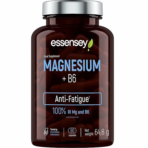 ESSENSEY MAGNESIUM + B6. Výživový doplnok. Prípravok v kapsuliach obsahujúci štyri formy horčíka a vitamínu B6. Horčík prispieva k zníženiu únavy a vyčerpania.