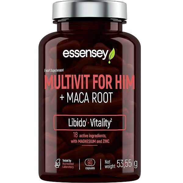 ESSENSEY MULTIVITAMÍN PRE MUŽOV + KOREŇ MACA. Výživový doplnok. Prípravok v kapsuliach s obsahom vitamínov, L-arginínu, extraktu z koreňa maca, DAA, taurínu, horčíka a zinku. Maca prispieva k udržaniu prirodzenej sexuálnej aktivity a energie. Stimuluje sexuálny apetít. Maca pomáha udržiavať optimálnu výdrž a vitalitu. Vitamín B6 a B12, zinok a vitamín C prispievajú k normálnej funkcii imunitného systému. Riboflavín, vitamín B6 a horčík prispievajú k zníženiu únavy a vyčerpania.