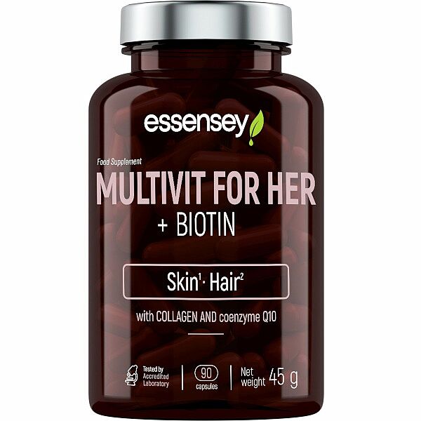 ESSENSEY MULTIVITAMÍN PRE ŽENY + BIOTÍN. Výživový doplnok. Prípravok v kapsuliach s obsahom vitamínov pre ženy, obohatený o kolagén, extrakt zo zeleného čaju, CLA, L-karnitín, kyselinu hyalurónovú a koenzým Q10. Tiamín, vitamín B6, vitamín B12, biotín a vitamín C prispievajú k normálnemu energetickému metabolizmu. Riboflavín, biotín a vitamín A prispievajú k udržaniu zdravej pokožky. Biotín prispieva k udržaniu zdravých vlasov.