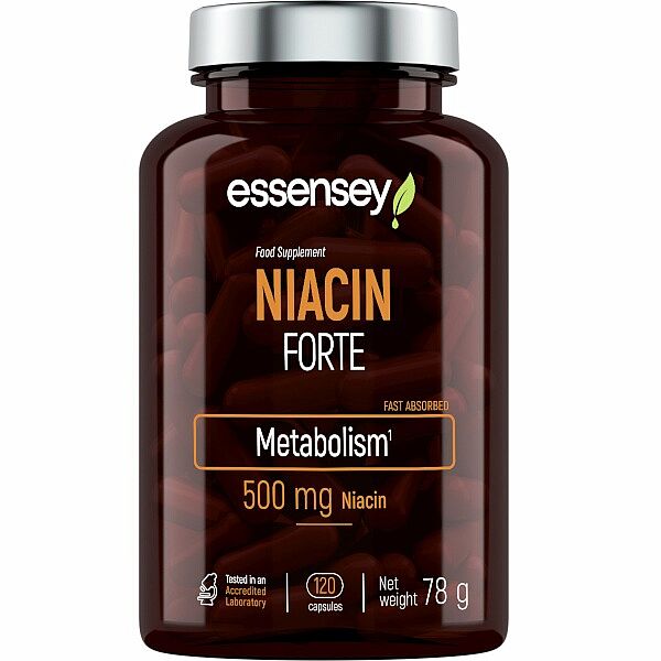 ESSENSEY NIACIN FORTE. Výživový doplnok. Liek v kapsuliach s obsahom 500 mg niacínu v každej kapsuli. Niacín prispieva k normálnemu energetickému metabolizmu a prispieva k udržaniu normálneho stavu pokožky.