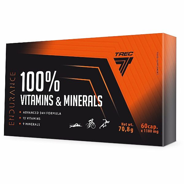 Trec Endurance 100% VITAMINS & MINERALS je produkt, ktorý sa skladá z 2 kapsúl: 100% VITAMÍNY (žltá denná kapsula) a 100% MINERÁLY (čierna nočná kapsula).