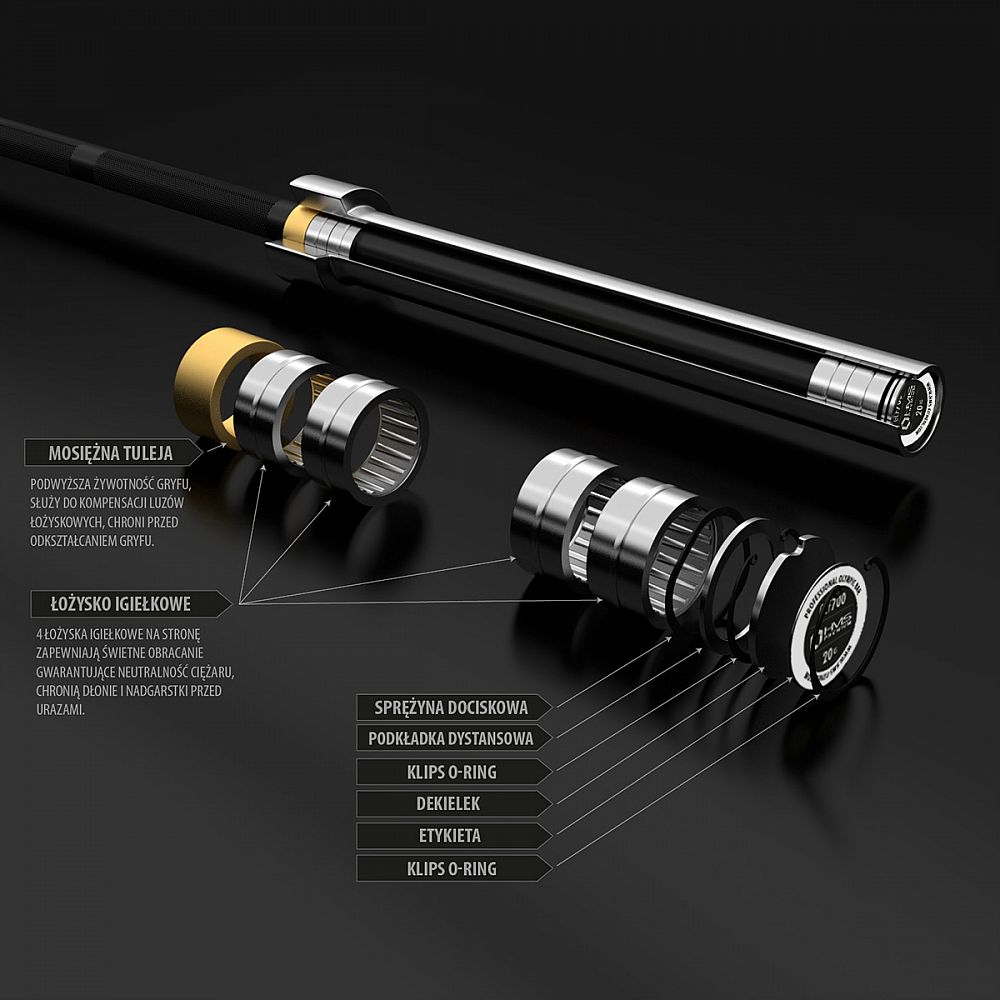 Olympijská os GCF700 HMS PREMIUM bola vyrobená zo špeciálnej chrómovanej ocele, ktorá prešla procesom kalenia. Produkt HMS sa vyznačuje pevnosťou v kombinácii s dokonalou pružnosťou. Súčasťou súpravy sú dva plastové uzávery ZG1000. Pevné a pohodlné uchopenie hriadeľa je zaistené vrúbkovaním na povrchu. Maximálne zaťaženie je 700 kg. Priemer úchopovej časti je 28 mm a zaisťuje vysokú odolnosť a pohodlie počas tréningu. Použitý proces chrómovania hriadeľa je zárukou zachovania jej vzhľadu po dlhú dobu jeho používania a tiež je najlepšou ochranou proti korózii. Olympijský hriadeľ GCF700 HMS PREMIUM má 8 ihličkových ložísk (4 na každej strane), ktoré umožňujú hladké a plynulé otáčanie rukávov na hriadeli. Jej konštrukcia znižuje napätie na koncoch valčekov, čo má za následok vyššiu životnosť ložísk. Napriek svojmu malému prierezu majú ihličkové ložiská vysokú tuhosť a nosnosť. Dva plastové uzávery nachádzajúce sa v balení zaručujú stabilné rozloženie záťaže na hriadeli počas tréningu. Uzávery majú vo vnútornej časti gumové elementy brániace tomu, aby sa závažie povolilo.