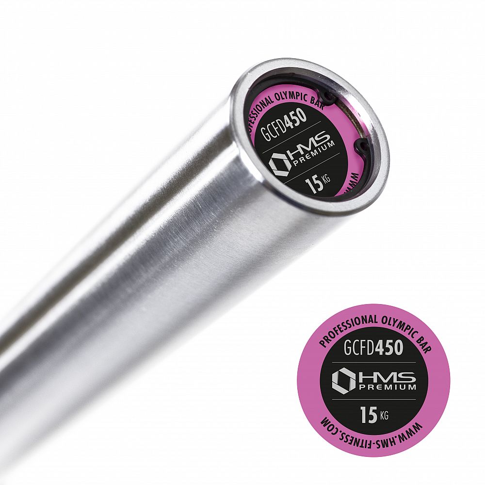Olympijská os GCF450 HMS PREMIUM bola vyrobená zo špeciálnej chrómovanej ocele, ktorá prešla procesom kalenia. Produkt HMS sa vyznačuje pevnosťou v kombinácii s dokonalou pružnosťou. Súčasťou súpravy sú dva plastové uzávery ZG1000. Pevné a pohodlné uchopenie hriadeľa je zaistené vrúbkovaním na povrchu. Maximálne zaťaženie je 450 kg. Priemer úchopovej časti je 25 mm a zaisťuje vysokú odolnosť a pohodlie počas tréningu. Použitý proces chrómovania hriadeľa je zárukou zachovania jej vzhľadu po dlhú dobu jeho používania a tiež je najlepšou ochranou proti korózii. Olympijský hriadeľ GCF450 HMS PREMIUM má 4 ihličkových ložísk (2 na každej strane), ktoré umožňujú hladké a plynulé otáčanie rukávov na hriadeli. Jej konštrukcia znižuje napätie na koncoch valčekov, čo má za následok vyššiu životnosť ložísk. Napriek svojmu malému prierezu majú ihličkové ložiská vysokú tuhosť a nosnosť. Dva plastové uzávery nachádzajúce sa v balení zaručujú stabilné rozloženie záťaže na hriadeli počas tréningu. Uzávery majú vo vnútornej časti gumové elementy brániace tomu, aby sa závažie povolilo.