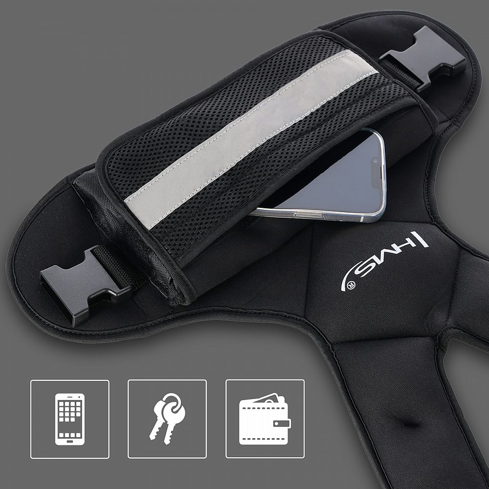 Vybavenie bolo navrhnuté s ohľadom na pohodlie užívateľa. Regulovateľné popruhy umožňujú dokonalé prispôsobenie akejkoľvek postave, a špeciálny neoprénový materiál je mäkký, odolný proti potu a zabraňuje skĺzavaniu vesty aj pri intenzívnych pohyboch. Elastické sieťované vrecko poskytuje priestor na uloženie telefónu, kľúčov alebo peňaženky, vďaka čomu sa tréning stáva ešte praktickejším.
