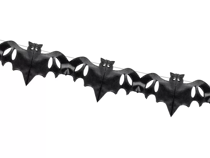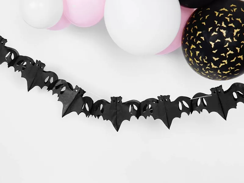 Papierová girlanda netopiere v čiernej farbe, vhodná na zavesenie pri halloweenskej akcii.
